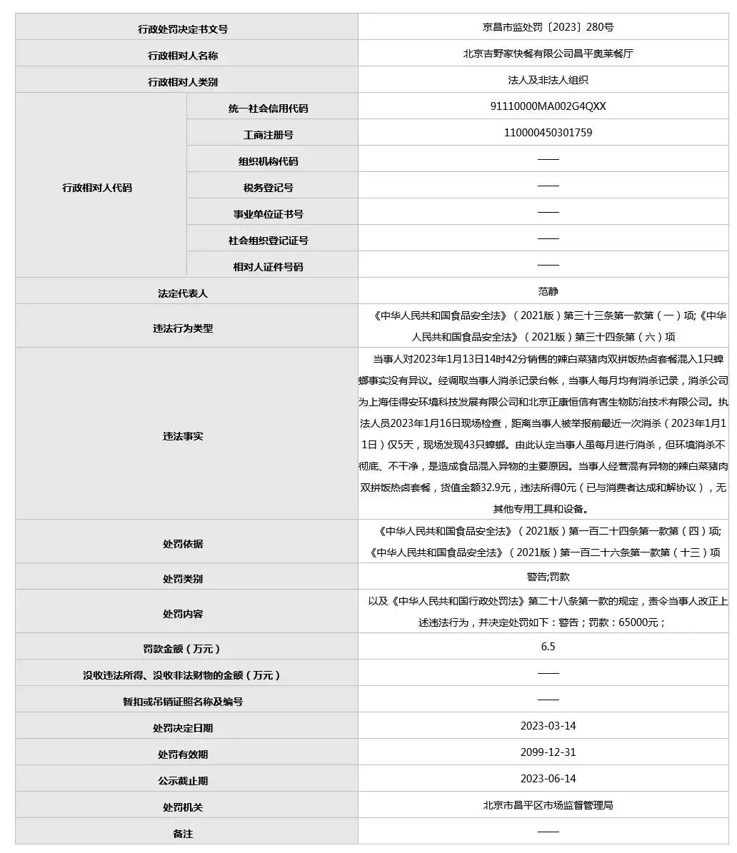 吃出蟑螂后,执法检查又在现场发现43只!吉野家一餐厅被罚日前,吉野家一餐厅因饭菜中混入蟑螂被罚6.5万元。据北京市市场监督管理局网站披露,北京吉野家快餐有限公司昌平奥莱餐厅因违反食品安全法,被北京市昌平区市场监督管理局警告、罚款6.5万元,处罚决定日期为2023年3月14日。