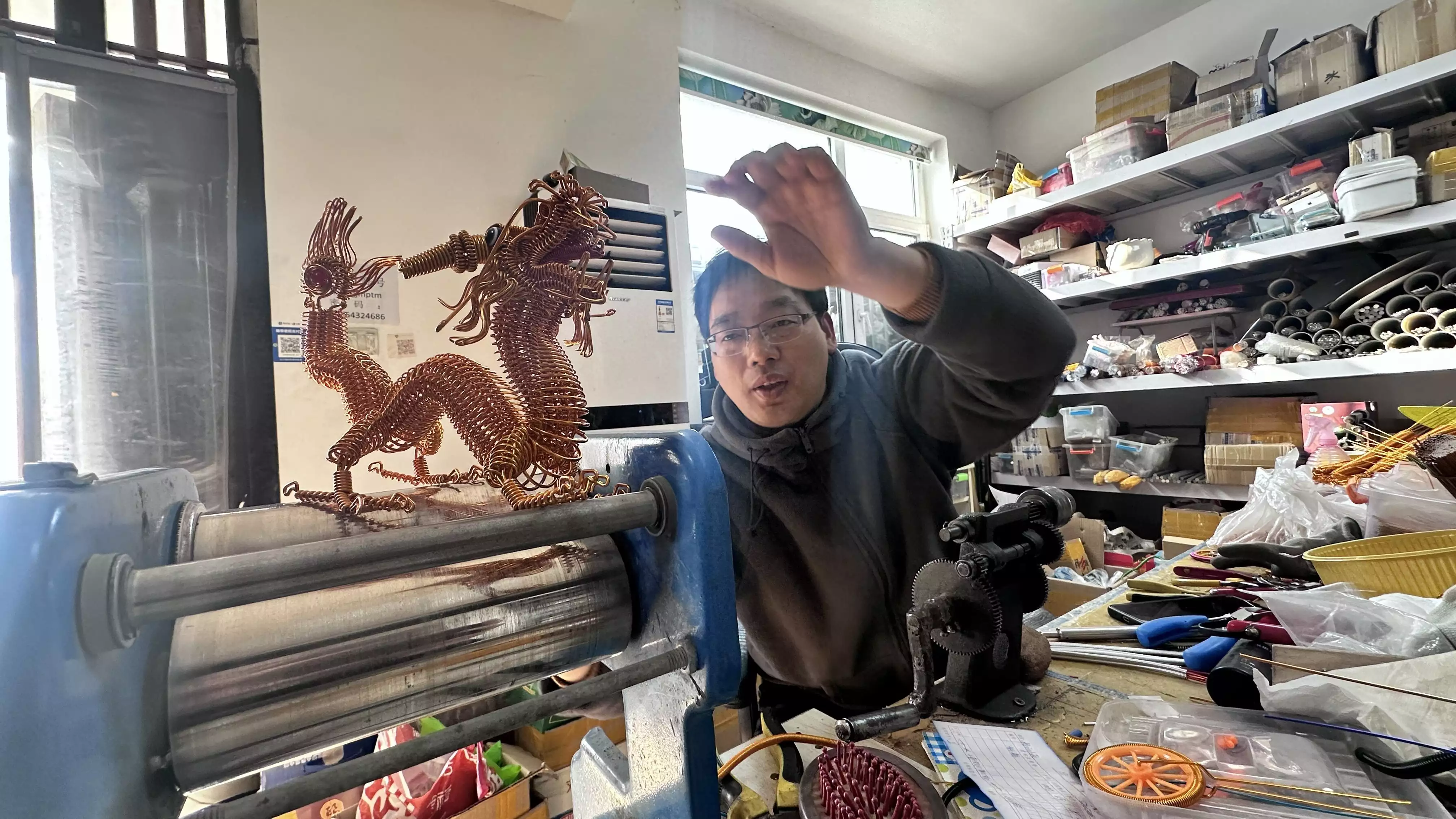 在村民杨训政不大的铝编工作室内,简易货架上一排排铜色铝线编制成的艺术品让人目不暇接。一条条铝制弹簧经过村民巧妙处理后,成了工艺品市场的抢手货:发财树、恐龙、摩托车、机器人……“我这铝编虽然产量低、规模小,订单可已经排到了今年10月底。龙年将至,来自海内外的订单让大家年前忙得不亦乐乎。”杨训政一边用钳子摆弄着铝编小龙,一边告诉记者。