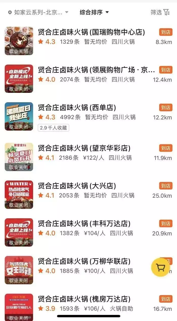 据北京商报报道,带有明星光环的贤合庄在北京市场按下暂停键。近日,第三方平台大众点评搜索北京地区“贤合庄”门店显示,页面已经没有贤合庄门店信息。随后,北京商报记者实地走访了此前经营的北京贤合庄门店,已经全部关闭。