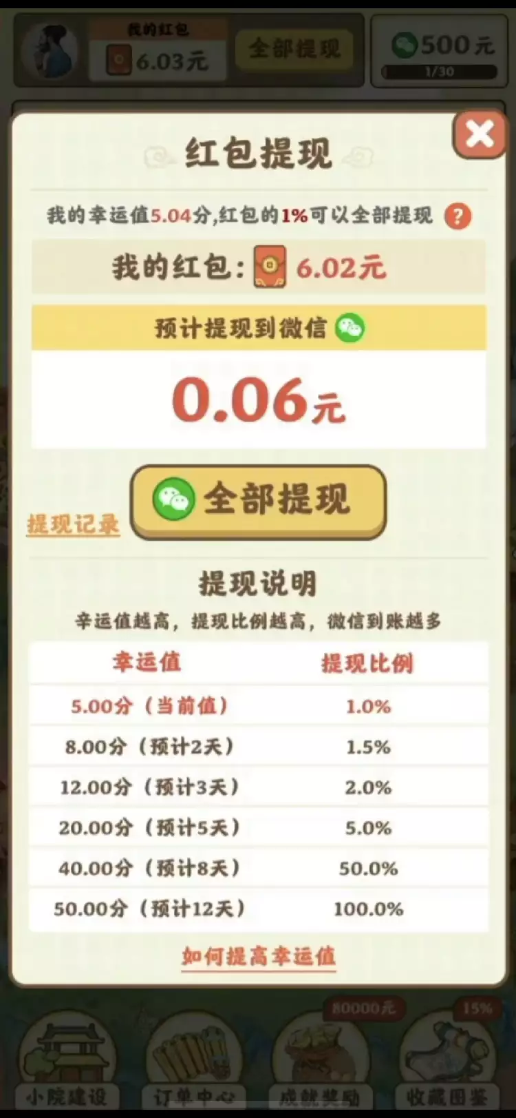 根据林小逗的实际测玩,他在完成了某个等级订单之后,账户“我的红包”中显示余额为6.02元,而因为幸运值为5分的原因,他只能提现显示金额的百分之一,也就是0.06元。