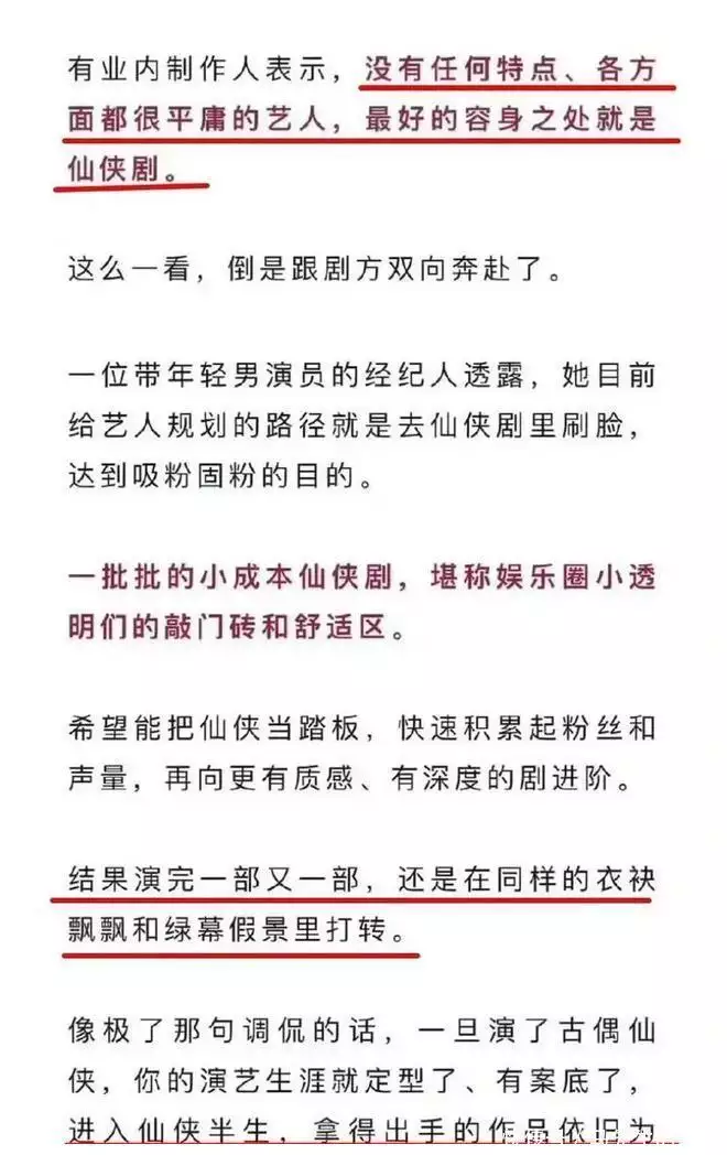 圈内人士:没有任何特点,各方面都很平庸的男女艺人,最好的容身之所是拍仙侠古偶剧。制片人杨晓培:自己制作的两部古偶让她遭遇有生以来最大黑暗期,想做《狂飙》《庆余年》这样高口碑的大爆剧。 平台领导、业内制作人、演员大部分都是一边质疑看不上古偶剧,一边疯狂接拍古偶剧,因为他们知道内娱90%以上的当红男女明星都是从古偶剧里爆出来的,比如肖战、王一博(陈情令)、杨幂(仙剑奇侠传三)、赵丽颖(花千骨)、迪丽热巴(三生三世十里桃花)、杨紫(香蜜沉沉烬如霜)、成毅(琉璃)、任嘉伦(锦衣之下)、檀健次(长相思),古偶就是超会爆人啊,就是超会吸粉,观众就是爱看底盘就是高,虽然古偶剧制作确实质量大部分都一般,有些甚至可以说很差。