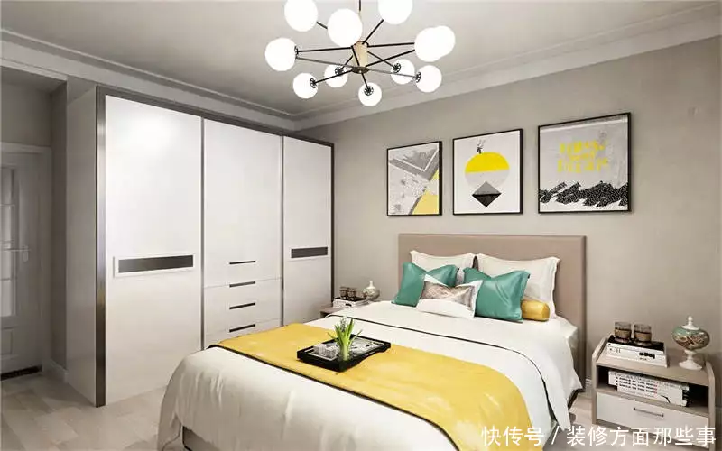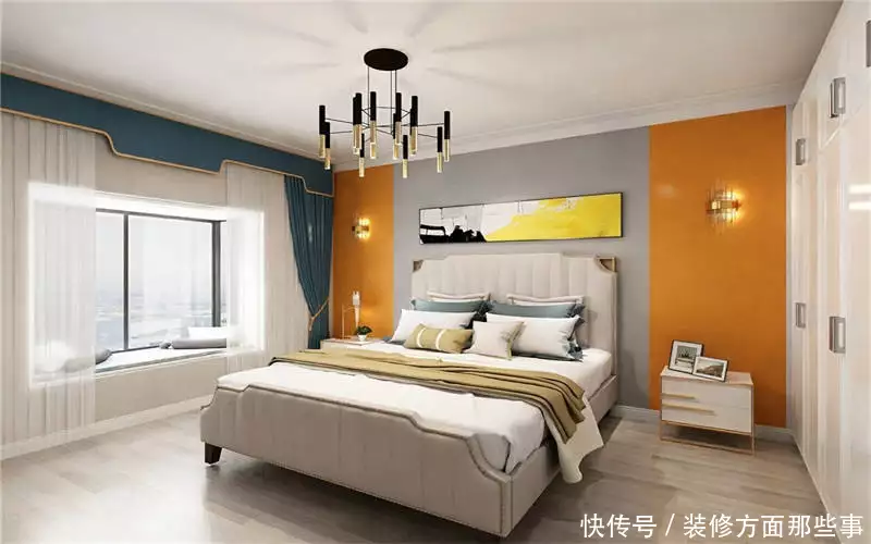 主卧室的床头为了迎合客户不想太复杂的要求,所以采用不同颜色的壁布来划分区域,床头两边的橙色同时也为空间增加了气氛,床头左右预留了壁灯,使男女主人在以后的使用上各不影响,同时也增加了室内的辅助光源。