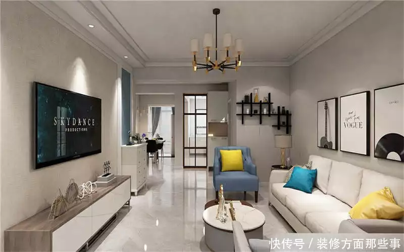 客厅影视墙采用对称的手法划分了三个区域,划分区域的造型线采用的是石膏板裁切的平板线叠加的方法,既能吻合设计的简约感也增添了造型上的层次。造型线内的颜色采用了奶咖色,材质用了壁布使设计更细腻。