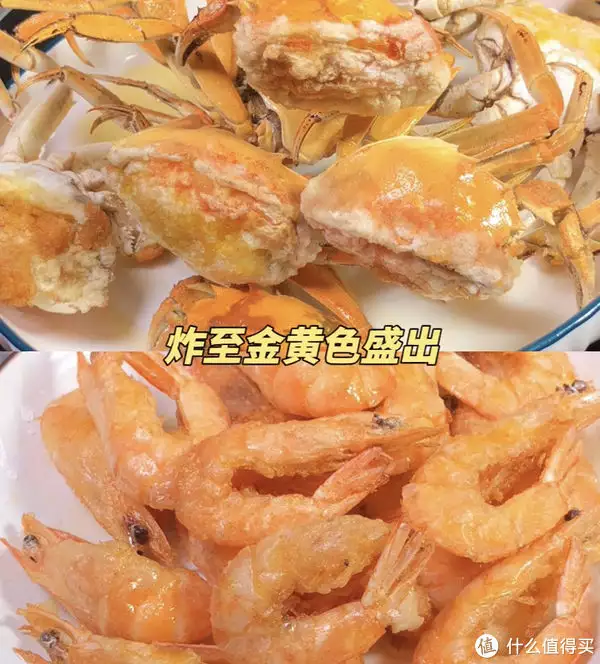 ②锅内倒入宽油,六成油温依次放入蟹,(切口处朝下)炸至定型成金黄色捞出,再放入大虾炸至表皮酥脆捞出