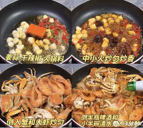 ③另起锅倒少许油,姜蒜头,干辣椒,半块火锅底料小火炒出香味炒出红油,接着倒入炸好的蟹块和大虾翻炒均匀,倒入半瓶啤酒,小半碗清水,盖盖煮2-3分钟,