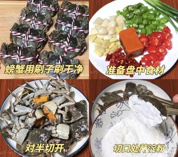 ①准备好所需食材,螃蟹用刷子刷干净,开壳去腮,处理干净后对半切开,螃蟹切口处蘸淀粉,大虾去虾线洗干净,表面撒点淀粉裹匀