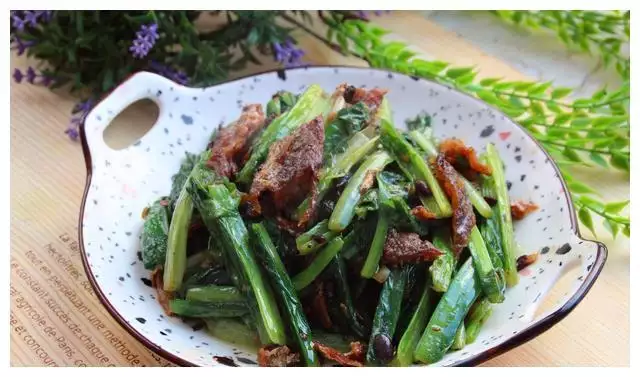 6.再下入蒜苔大火煸炒,将蒜苔炒制稍起皱皮,加入少许盐,翻炒均匀,腊肉盐味重,盐要少放,给蒜苔调些味就可以了,蒜苔表面有一层膜,把蒜苔炒的稍起皱皮,就容易入味了。蒜苔不宜烹制得过烂,以免辣素被破坏,杀菌作用降低。