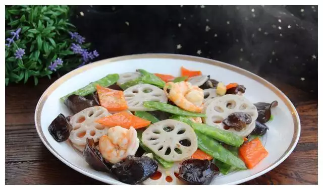 所需材料:莲藕、荷兰豆、木耳、胡萝卜、大虾5-6个、油盐适量、大蒜2瓣、鸡精1茶匙、白胡椒粉半茶匙、料酒半汤匙、水淀粉适量、