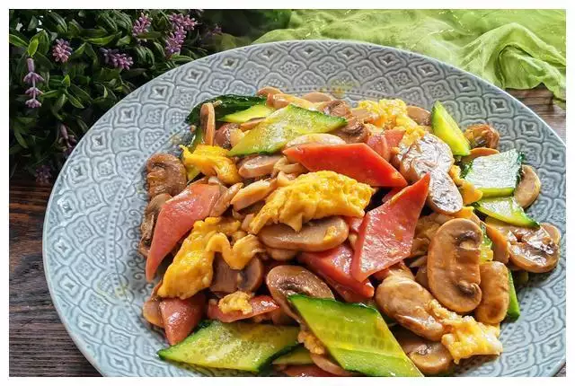 所需材料:口蘑半斤、鸡蛋2个、黄瓜半根、火腿肠1根、油盐适量、葱1段、姜2片、大蒜2瓣、蚝油1汤匙、鸡精1茶匙、