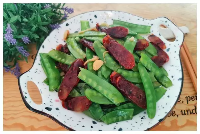 7.下入腊肠,一起大火快速翻炒均匀,关火,盛出装盘即可,一盘好吃味美的荷兰豆炒腊肠就做好了。