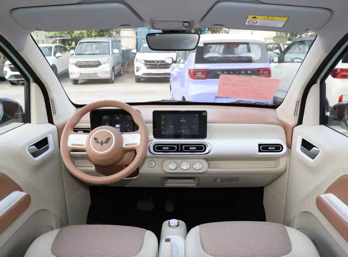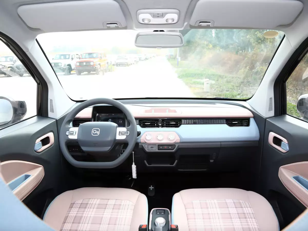 咱们还是先从QQ冰淇淋开始,来到它的车内,可以看到整车简约的设计,而红蓝的配色还是足够耐看的,两辐式方向盘的设计也是可圈可点,三个圆形的按键也起到了极好的点缀作用,只是没有中控大屏还是有些掉价,亦给人一种廉价感。