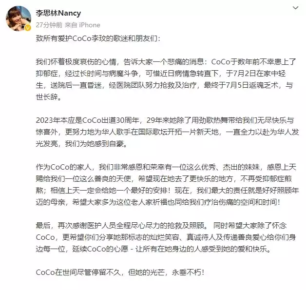 7月5日晚,知名歌手李玟的姐姐李思林在微博发文表示,李玟因抑郁症在7月2日于家中做出轻生举动,送院后一直昏迷,经过多日抢救无效,最终于7月5日离世。