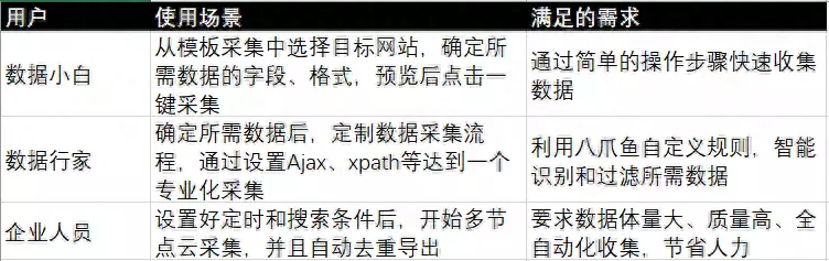 最后整合数据,实现数据源源不断的进入系统。让整个数据采集,分析,决策的过程实现自动化。针对以上的数据需求,参考类似竞品调研,将八爪鱼的用户分为数据小白、数据行家、企业用户,并总结了他们各自的使用场景和需求。