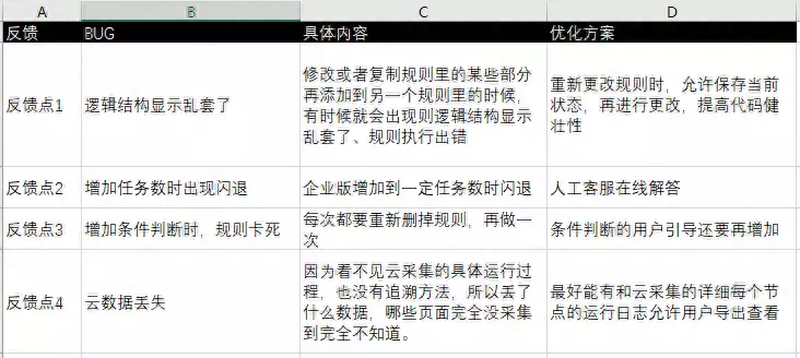 用户反馈数据偏少,可能未客观全面反映出产品存在的问题。产品的bug主要出现在采集数据的操作过程中,是产品的核心操作,直接影响用户体验,建议联系反馈者,并测试bug是否存在,如果bug还原,及时处理,如果bug未还原,进入观察期。采集数据操作的简易型是用户选择八爪鱼的重要因素,对于模板采集需要增加更多的模板,可以从两个方面入手,一是开设模板上传功能,让用户在采集完成后觉得不错,稳定性高的模板采用积分鼓励的方式上传,二是创建官方的博客专区,放置更多的模板和介绍,并让用户留言的方式增加互动性,也可以解决一部分的技术问题。对于自定义采集,对于一些常用的网站可以在自定义识别后,自动保留上一次在该网站进行采集的流程,可以减少因为条件增加的基础上导致规则崩溃的问题。关于任务数上限的问题,在同时启动多少个任务下效率最高,且不会卡死,是一个待解决的问题。三、总结