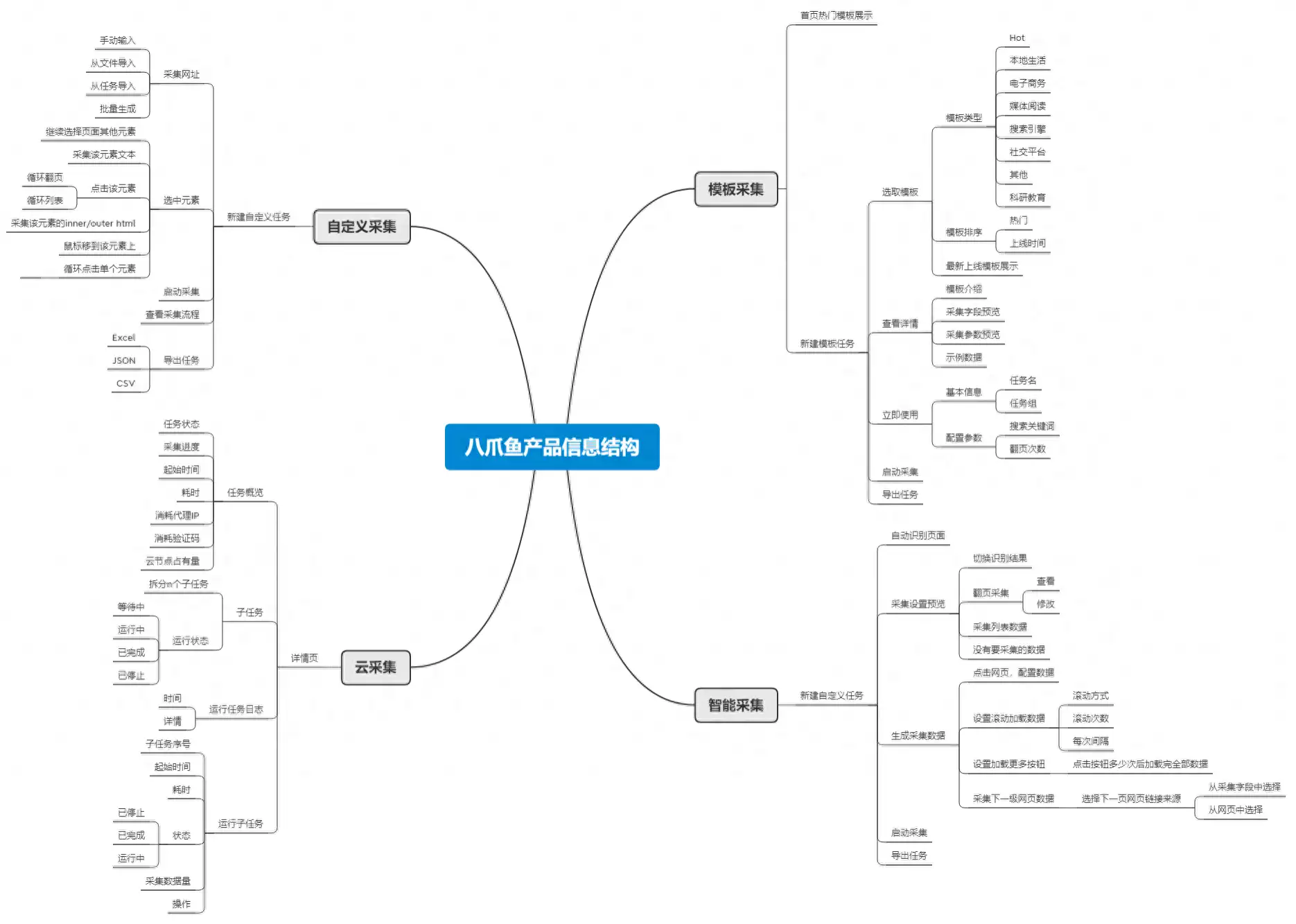 为了更加全面地了解八爪鱼产品,本调研梳理了产品的核心架构,具体内容如下图所示: