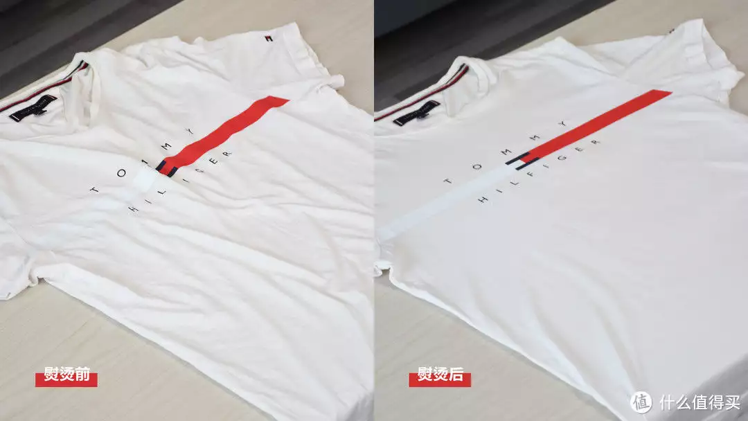 通过这张图来看看实际的熨烫效果,这是一件穿了很久的T恤,熨烫以后褶皱明显少了很多。