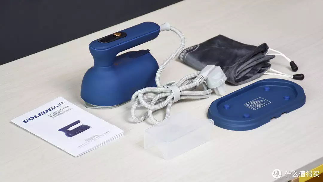 分享一组全家福,包含有电熨斗、水杯、底座、绒布收纳袋和使用说明书。