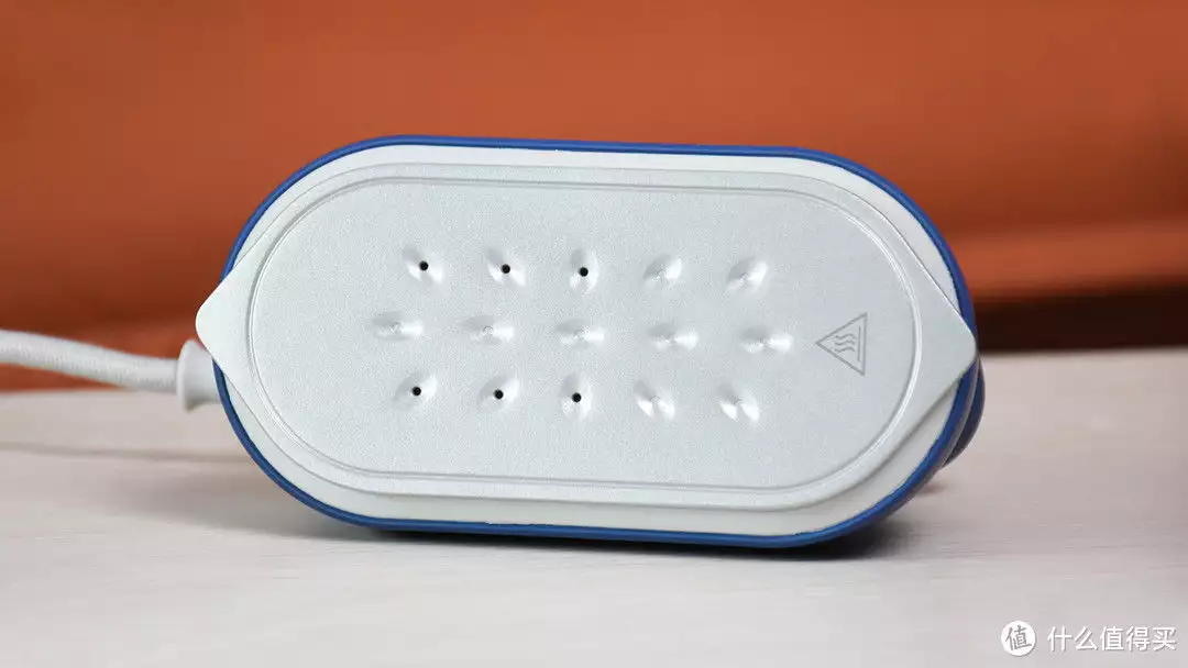 机身底部是一块大面积的铝压铸板,表面质感比较光滑,和衣服接触不会有太大的阻尼,熨烫移动的时候比较顺滑。大面积也能增加和衣服接触的面积,提高熨烫效率。中间有六个小圆孔,用于释放蒸汽。