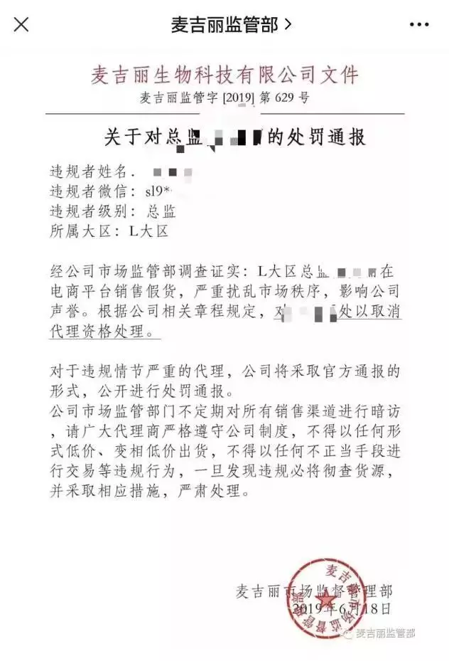2019年6月,林女士收到麦吉丽市场监督管理部门发来的一份“处罚通报”。其中显示,其因“违规销售假货,严重扰乱市场秩序”,被处以“取消代理资格”,并且没收2万元押金。