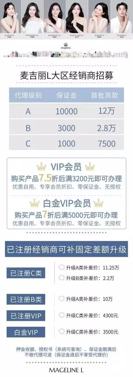 记者从张晨提供的宣传海报中看到,麦吉丽发布的一份“全国经销商门槛”海报显示,代理级别分为A类、B类、C类三个层级,对应的保证金分别为1万元、3000元、1000元。“A类、B类、C类分别与一级、市级、分销的代理层级相对应。前者是麦吉丽海报宣传上的对外表述,后者是内部统称。”张晨称。