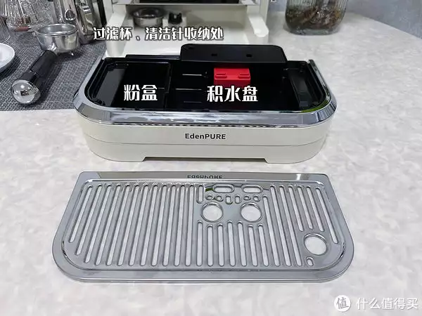 接水盘为可拆卸设计,这样清洁起来就会方便很多。接水盘内部分设粉盒和积水盒,同时还设置有浮标,满水时可以提醒你及时清理。取下接水盘后,你会发现内侧还设计有专门收纳过滤杯、清洁针的位置,这点蛮人性化的。