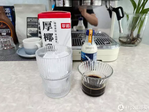 当下最火的要属生椰拿铁,甚至也成了某品牌咖啡的代名词,那我们也来制作一杯生椰拿铁。网上买了厚椰乳,这个是专门用来调制咖啡等茶饮的。冰块当然不能少,牛奶也要加一些,浓缩咖啡+厚椰乳+牛奶+冰块=生椰拿铁。