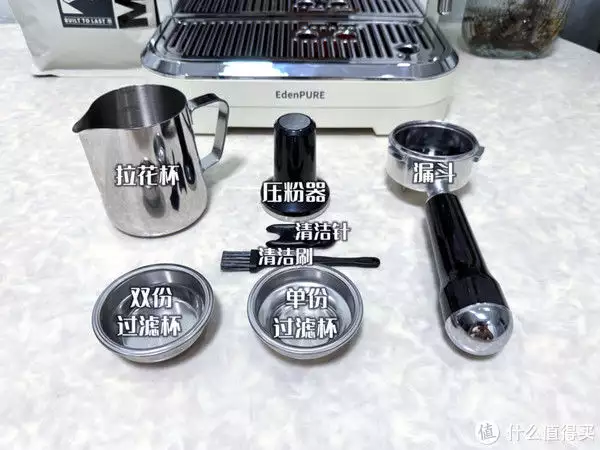 再来看看宜盾普咖啡机的各种配件,漏斗、过滤杯、压粉器都是标准配置,其中过滤杯有单份、双份两种容量的,还配有拉花杯,圆口的拉花杯对新手还是比较友好的。另外还配有清洁刷和清洁针。