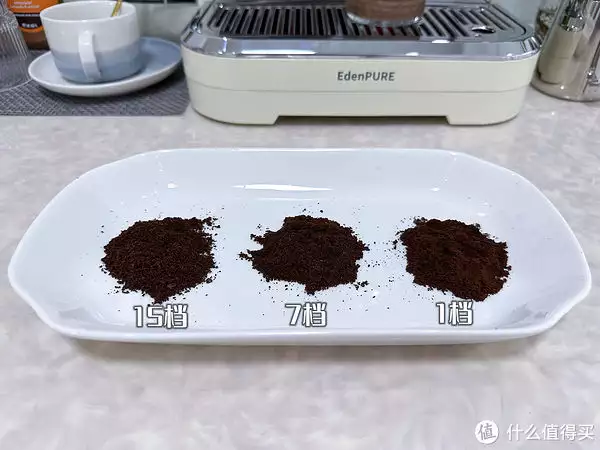 来看看各档的研磨效果,1档最细,15档最粗,不管哪一档出粉都粗细均匀。我家用的是深烘焙的豆子,我一般磨得较细。