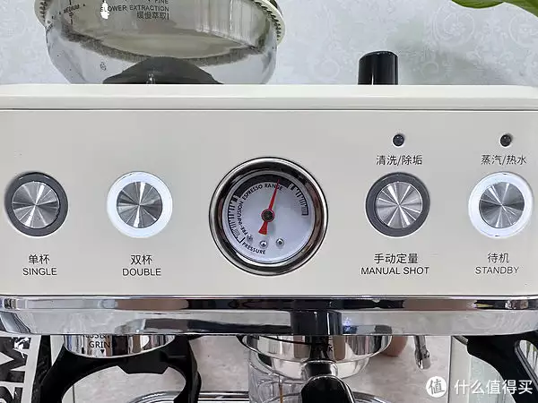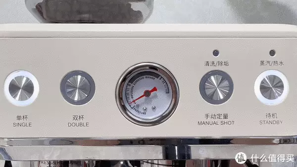 咖啡机的控制面板设置在上部,操作起来更为方便。控制面板设置了4个功能按键,可通过短按、长按实现不同功能,中间是压力表,可实时显示萃取压力,这个压力表真的太重要了,用过你就会知道它的好了。