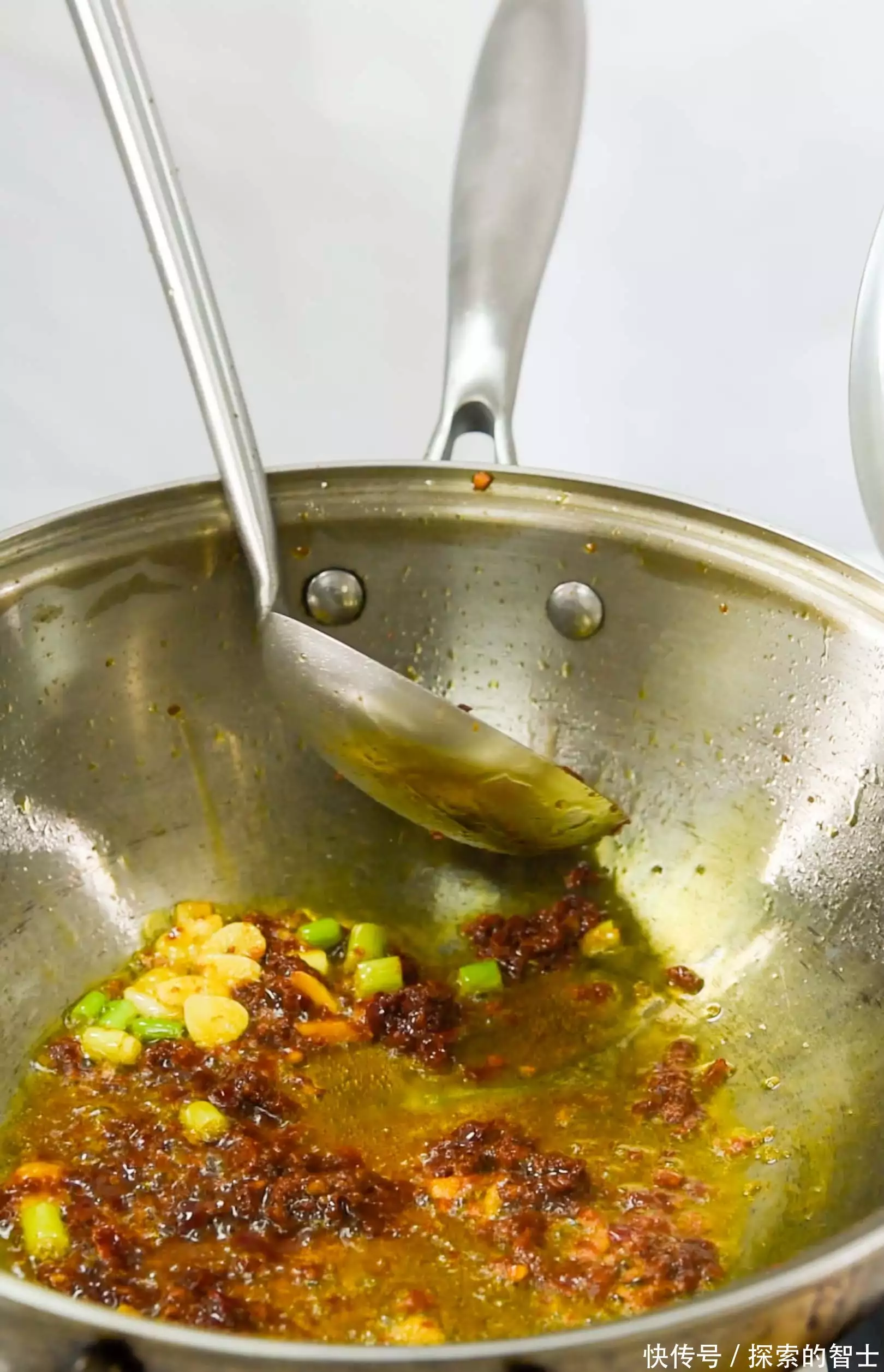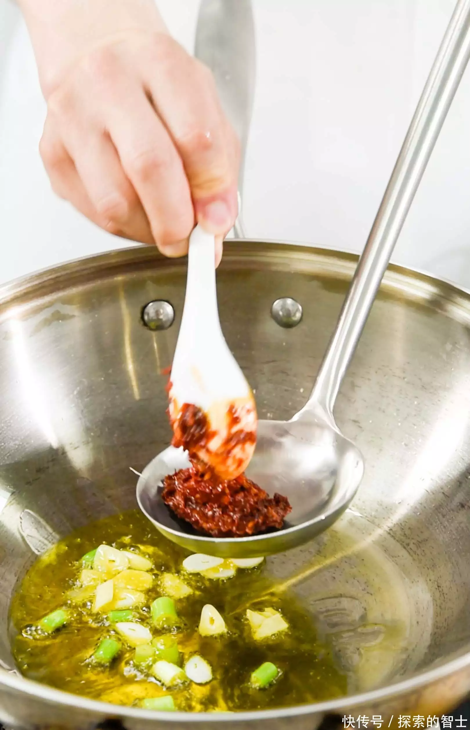 然后再加入豆瓣酱,一起小火炒香炒酥。