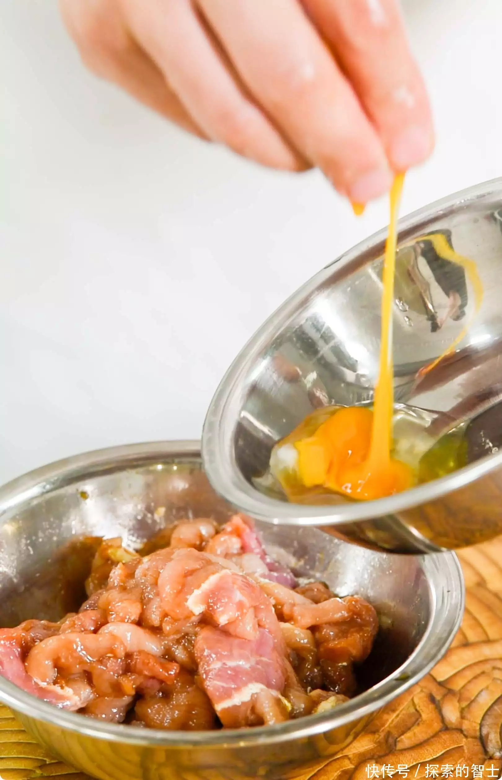 1 里脊肉切成肉片后要进行生粉和鸡蛋液,乃至部分调料进行浆制,这样在冷藏15分钟后,肉片不仅变得富有质感,同时也更入味,为后面煮制奠定基础。