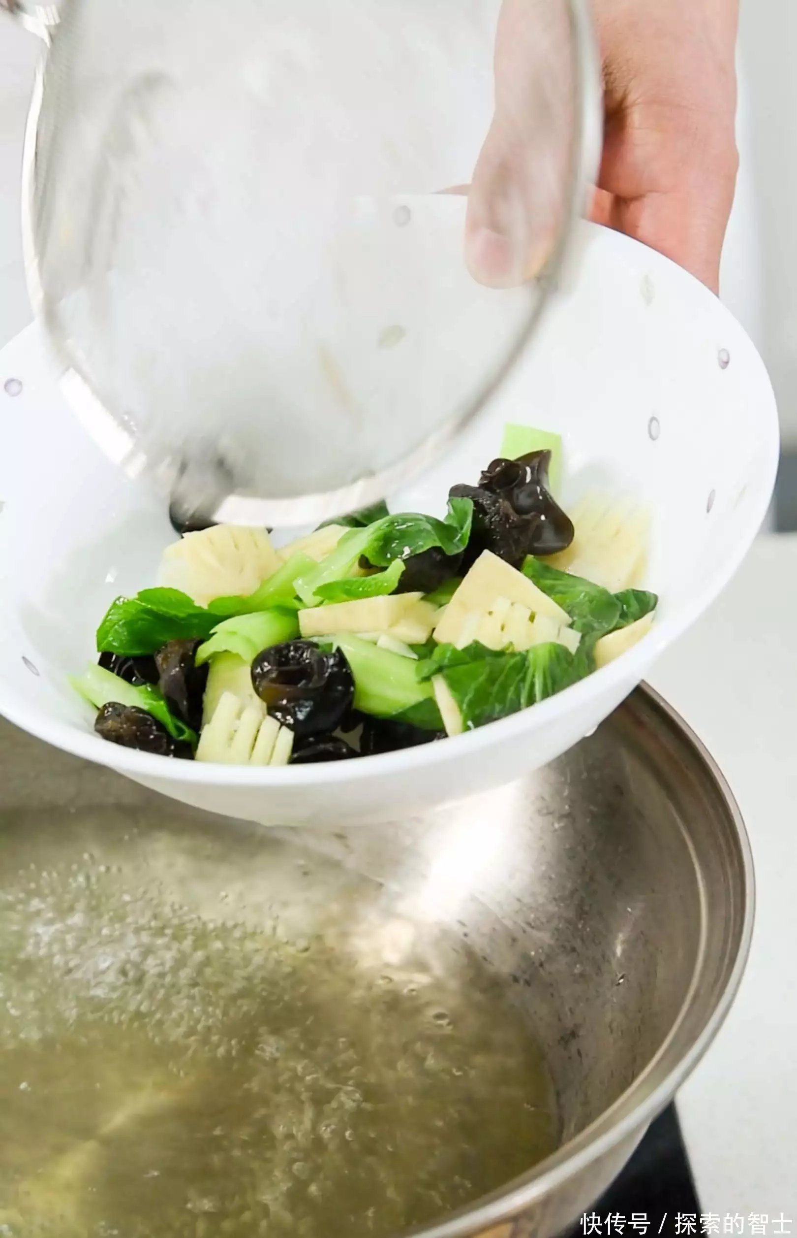 2 配菜在加盐的水锅中煮制,一定要注重时间,时间过久菜容易变绵软,这样吃起来就口感基本上丧失了。