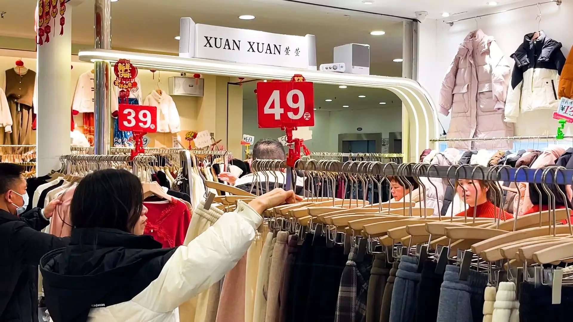 临近春节,武汉汉正街品牌服饰批发广场进行年底特卖,出现众多百元羽绒服、大衣等,引发关注。