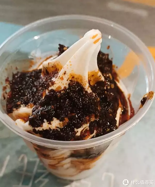 最后,就是属于近段时间最著名的油泼辣子新地,虽然这款冰淇淋名字中带有“辣子”,但实际上并不是很辣。冰淇淋的冰凉和油泼辣子的辛辣完美地抵消了,剩下的则是一种咸甜口感。然而,对于这款冰淇淋的味道评价却是各不相同,但想来应该不会有人觉得特别好吃吧。
