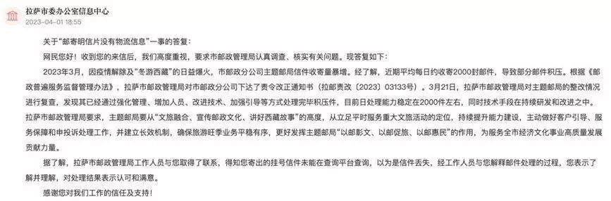 收到留言后,拉萨市高度重视,要求市邮政管理局认真调查、核实有关问题,并将情况反馈给网友,答复如下: