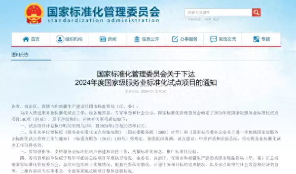 核心提示:中国网讯 近日,国家标准化管理委员会印发《国家标准化管理委员会关于下达2024年度国家级服务业标准化试点项目的通知》,下达2024年度国家级服务业标准化试点计划项目140项