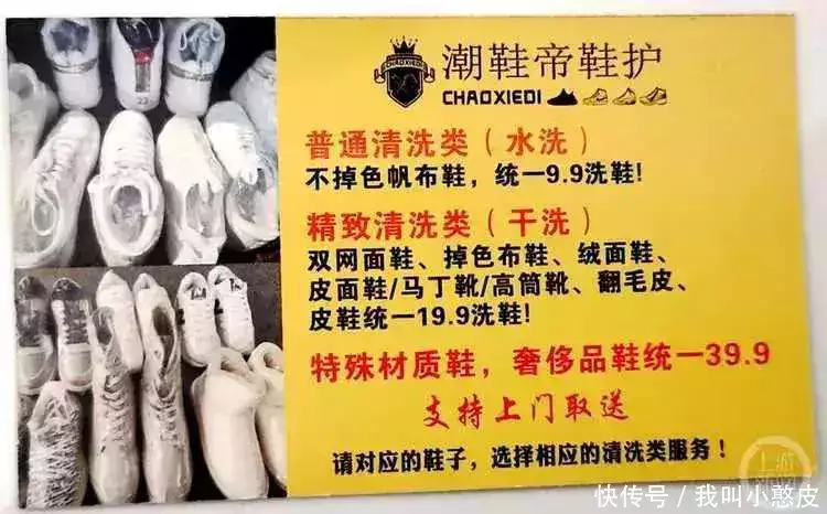 精致清下洗类,也就是干洗,(比如一些网面鞋,掉色布鞋,皮鞋,高筒/马丁靴),统一价19.9元一双。
