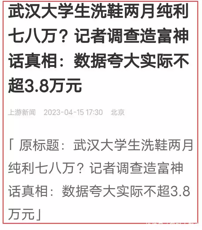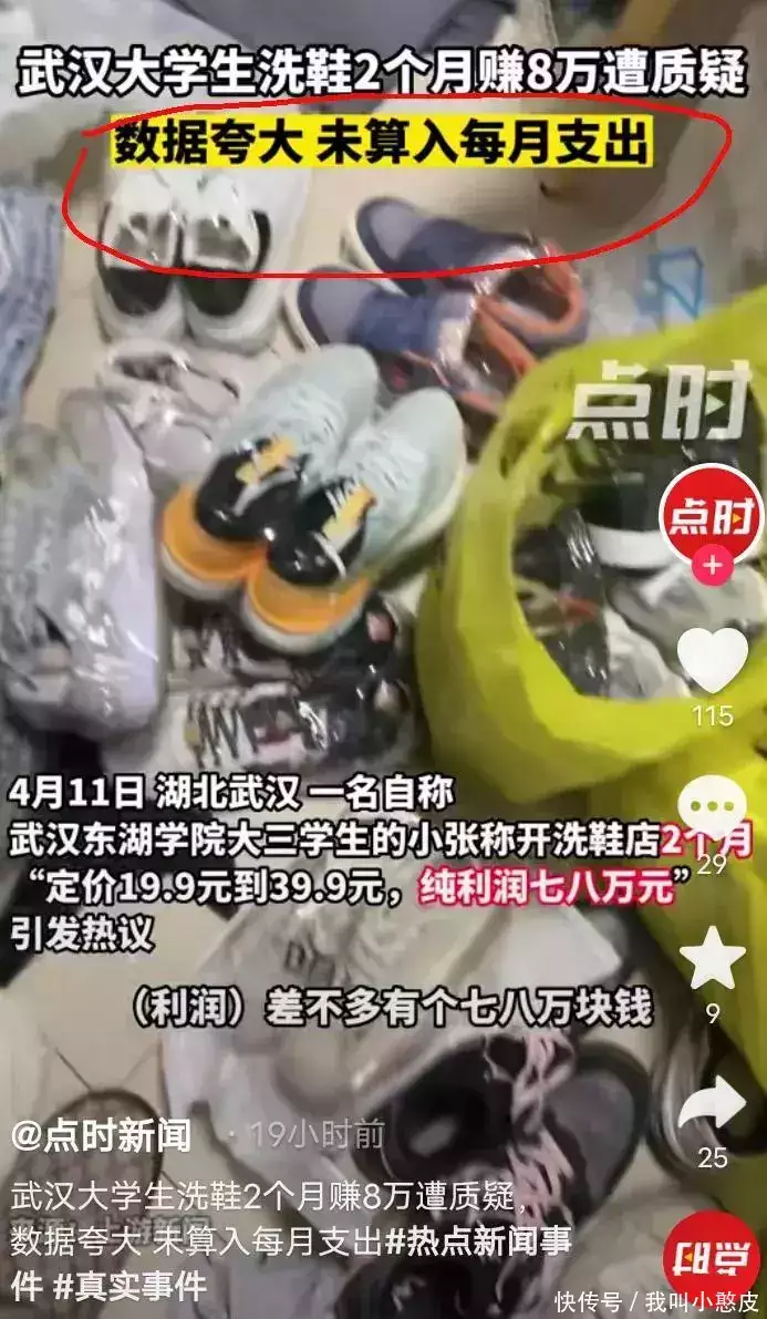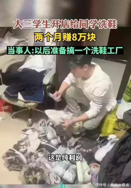 最近的一则报道也火遍了全网,迅速引起了广大网友的注意,媒体报道称:武汉一名大学生,利用学习之外的时间帮大学生洗鞋,两个月纯赚80000元!