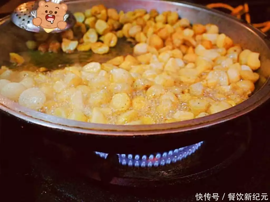 喊了快半个小时,终于有对小情侣要了一份,将土豆切成小圆块,然后放入油锅中高温油炸,经过油炸之后的土豆更加松软香脆。